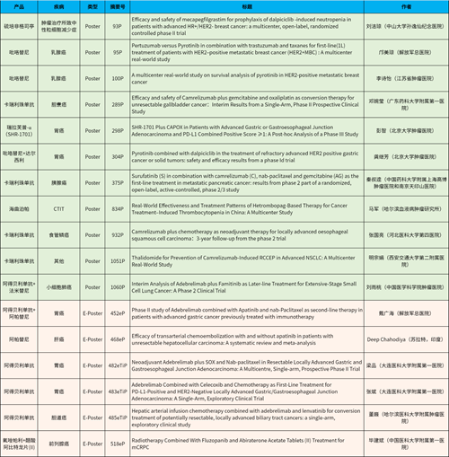 此外,吡咯替尼、瑞拉芙普-α(SHR-1701)、阿帕替尼、达尔西利、氟唑帕利、醋酸阿比特龙片(II)等抗肿瘤新药在乳腺癌、胃癌、肺癌、前列腺癌等多个疾病领域,一共入选了4项壁报展示和2项电子壁报。海曲泊帕和硫培非格司亭分别在肿瘤治疗所致血小板减少领域及中性粒细胞减少症领域共入选2项壁报展示。